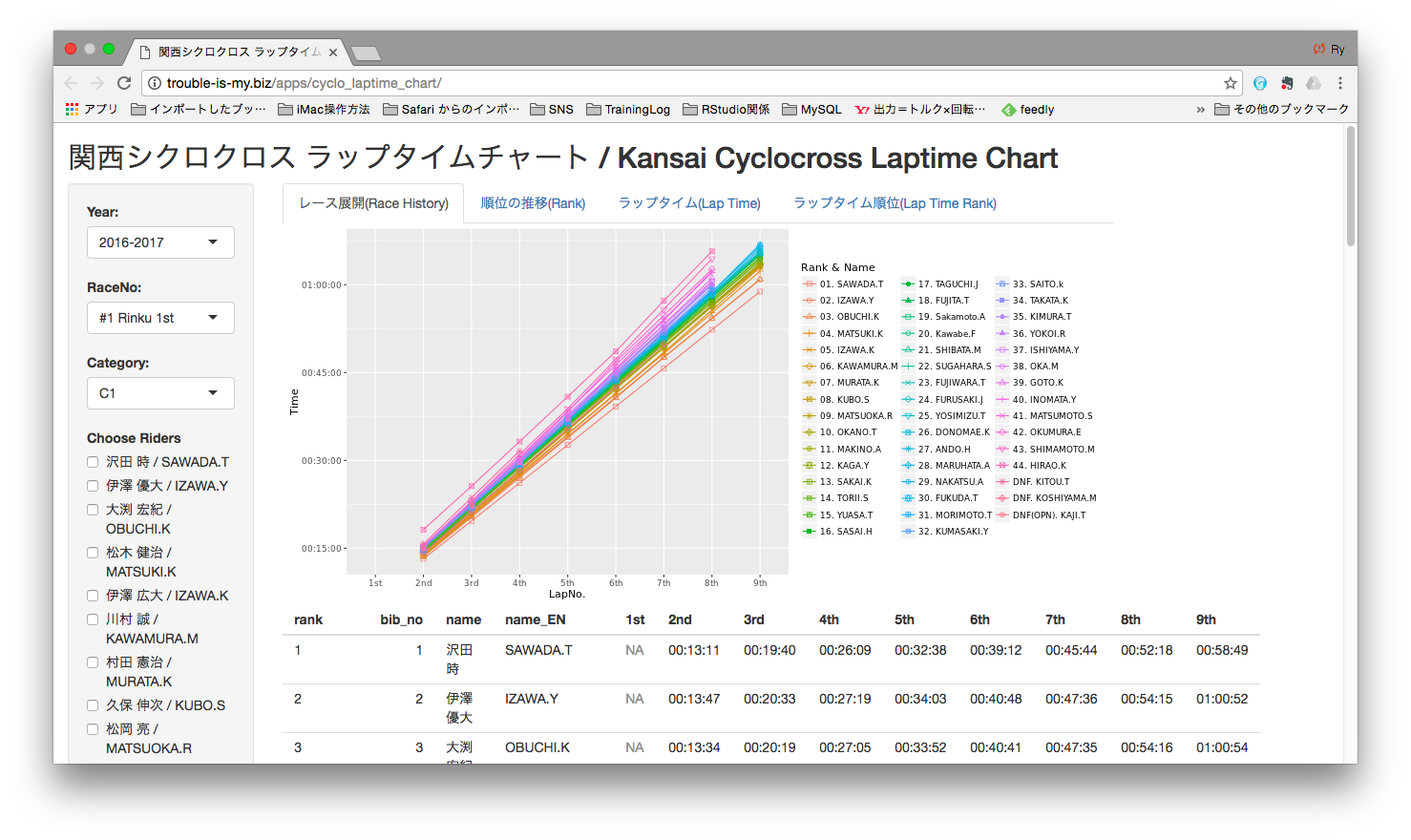 レース展開タブ - レース全体の結果を見ることが出来ます。下側に行くほど速いことを意味します。 Race history tab - shows the overall race result. Each lines show the result of each racers. Lower line is faster.