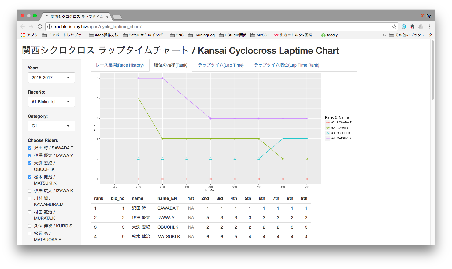 順位の推移タブ - 各周ごと通過順位を見ることが出来ます。下側に行くほど速いことを意味します。 Rank tab - shows the ranking of passing through the finish line per each laps. Lower line is faster.